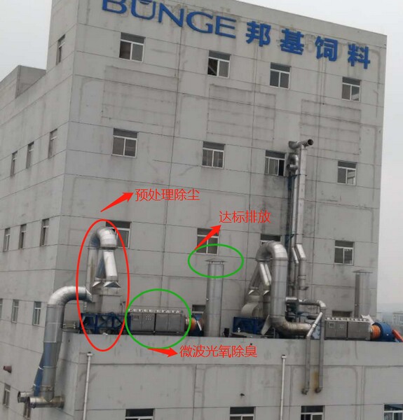 1、項目簡介:邦基(南京)農牧有限公司隸屬于世界500強企業邦吉集團。主要生産蝦料、螃蟹料、畜禽料等配合飼料。公司有兩條膨化線主要生産蝦料、螃蟹料,生産過程中烘幹、冷卻工藝段産生大量異味廢氣。邦基公司本着爲社會負責任的态度,2016年8月與藍雨禾開始技術交流、論證。經過多次考察、嚴格篩選,最終選擇藍雨禾設計并承建該項目。該項目于2017年4月初建成投運。自投運以來始終保持系統穩定、除臭效果優異、設備處于良好運行狀态,獲得了客戶的高度評價。該項目是南京飼料廢氣除臭、南京飼料廢氣處理的标杆工程。